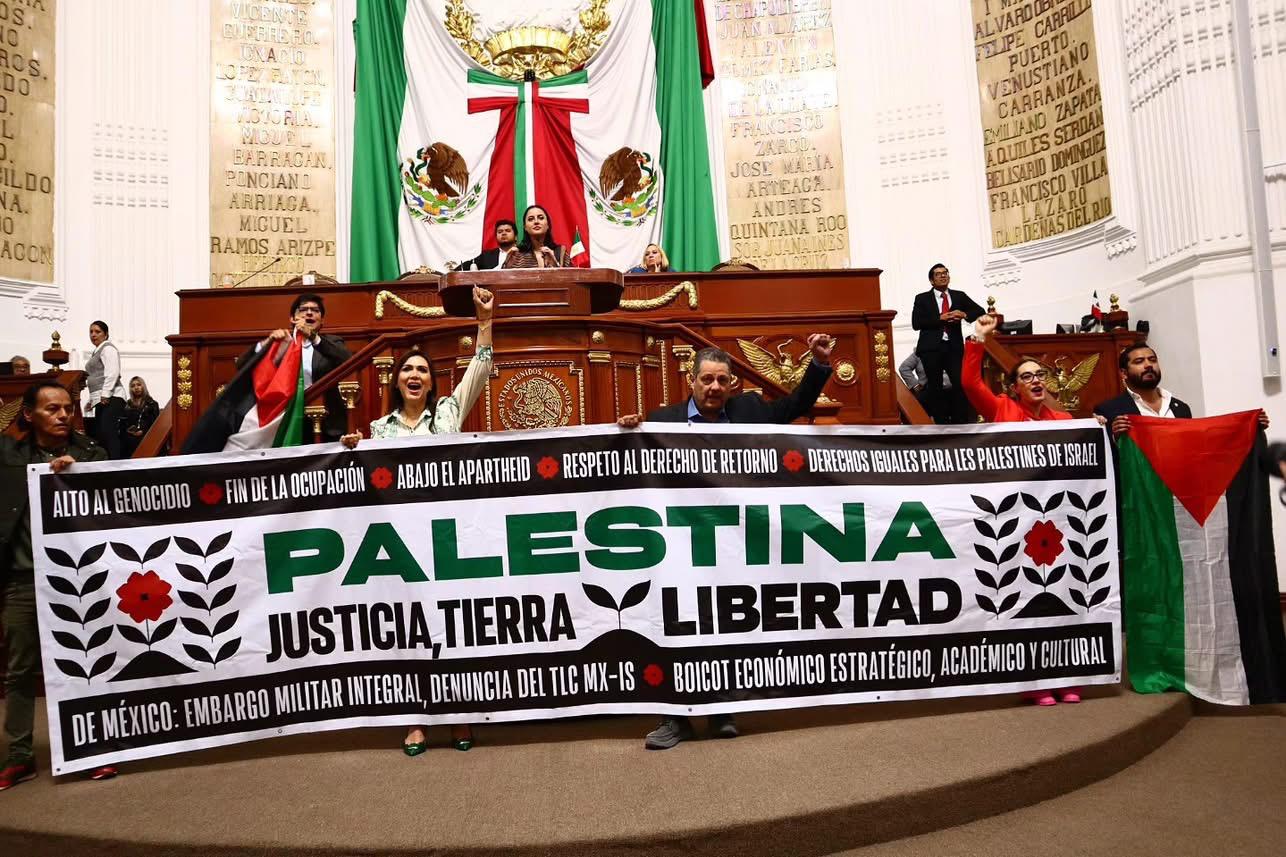 نواب البرلمان في المكسيك يرفعون يافطة تقول الحريه لفلسطين وأوقفوا الابادة وانهوا الاحتلال ومقاطعة إسرائيل دبلوماسيا وتجاريا وعسكريا