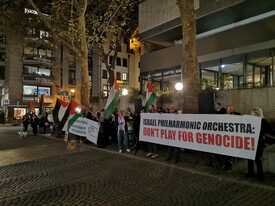 وقفة احتجاجية على فرقة موسيقى اسرائيلية امام قاعة مسرح في مدينة كولون / المانيا تحت عنوان لا تعزفوا للابادة الجماعية