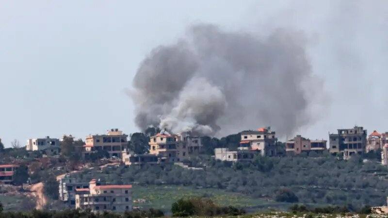 دخان يتصاعد من بين المنازل في بنت جبيل بعد قصف جوي في أبريل/نيسان 2026