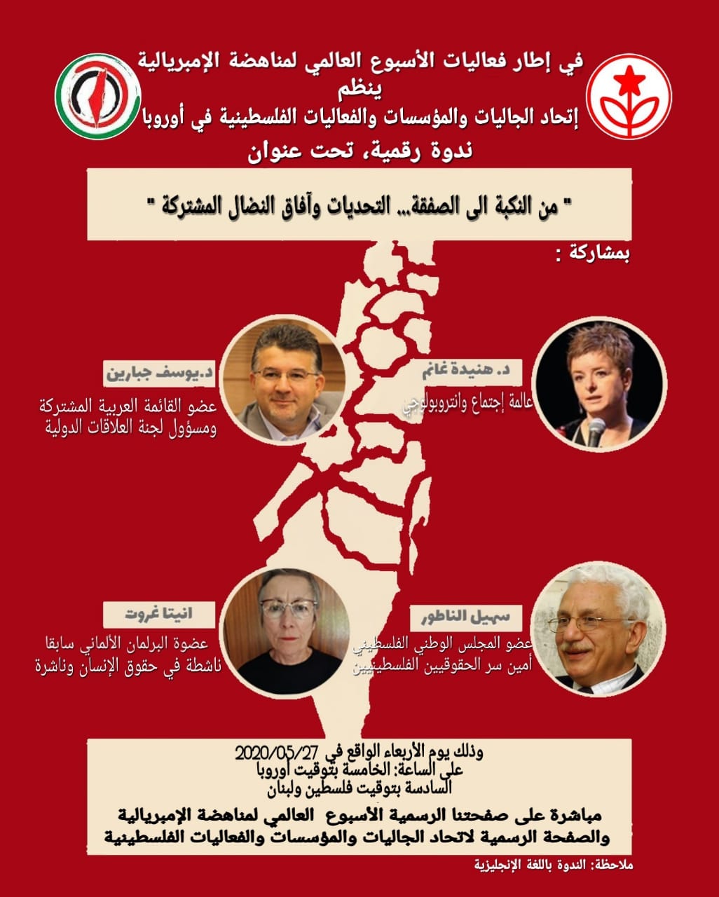 في إطار فعاليات الأسبوع العالمي لمناهضة الإمبريالية ينظم اتحاد الجاليات والمؤسسات والفعاليات الفلسطينية في أوروباندوة رقمية ، تحت عنوان