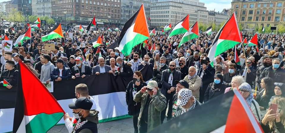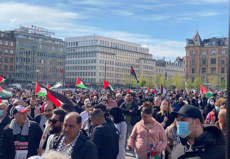 رفع المتظاهرون الاعلام الفلسطينية واليافطات الداعمة لصمود الشعب الفلسطيني في القدس وغزة و الضفة والأراضي المحتلة عام ١٩٤٨ وهتفوا بالتحية لصمودهم الاسطوري بوجه جيش الإحتلال الاسرائيلي و قطعان المستوطنين في هجمتهم البربرية الهادفة لاقتلاع سكان القدس من بيوتهم و الامعان في ارتكاب المجازر بحق ابناء قطاع غزه المحاصر