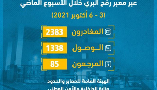 وأفادت الهيئة في تصريح صحفي، بأن العمل عبر المعبر شهد الأسبوع الماضي مغادرة 2383 مسافرًا، ووصول 1338 عائداً، في حين أرجعت السلطات المصرية 85 مسافراً.