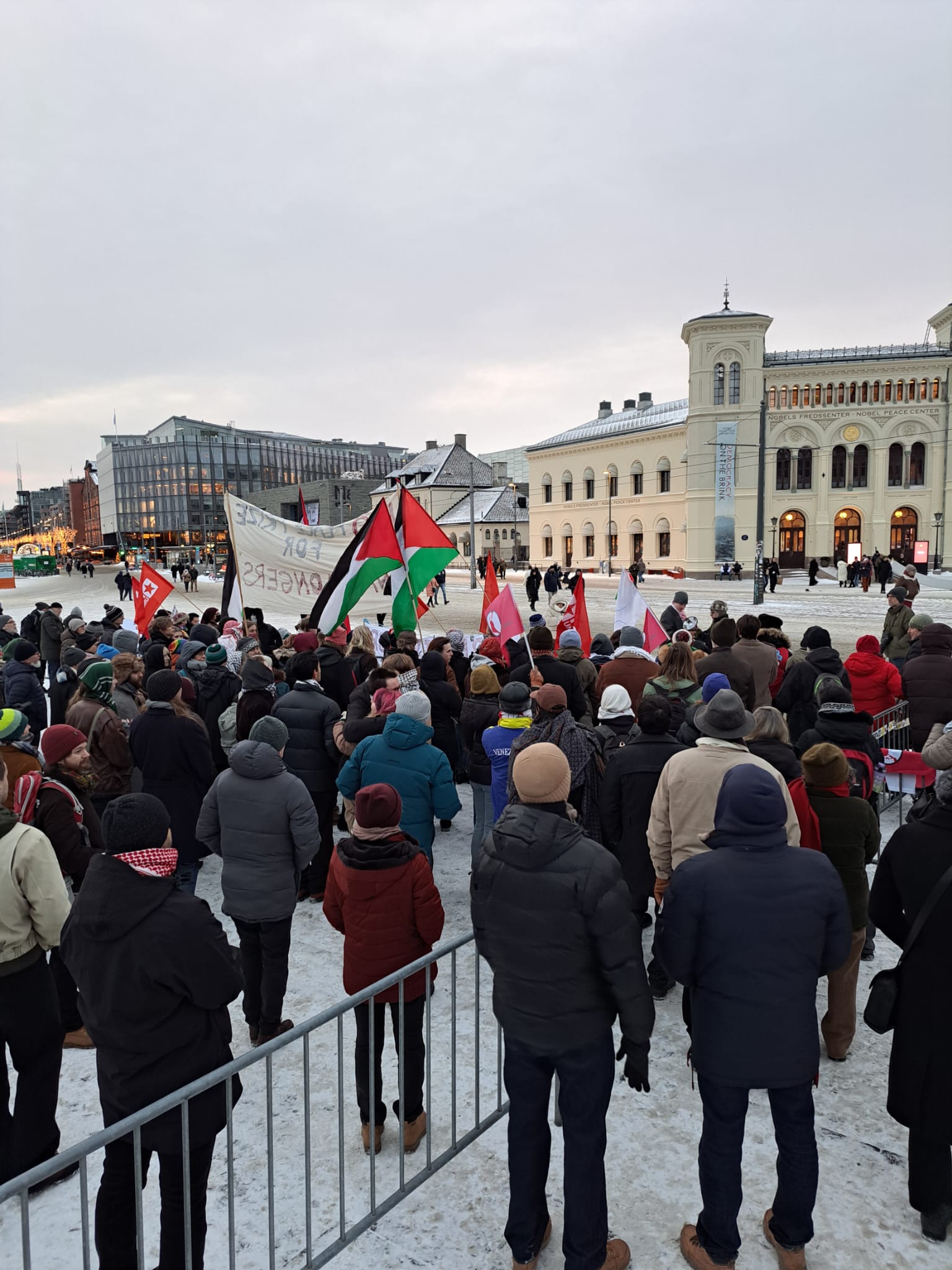 بدعوة من عدد من المؤسسات والمنظمات ومشاركة التجمع الديمقراطي الفلسطيني في النرويج ، وقفة حاشدة اليوم السبت 03/ يناير 2025 أمام مركز نوبل للسلام في العاصمة اوسلو تضامنا مع فنزويلا واستنكارا للبلطجة الأمريكية، رفعت فيها اعلام فنزويلا، والاعلام الفلسطينية ، واليافطات المنددة بالسياسة الأمريكية والاسرائيلية ، ودعوة الحكومة النرويجية الى إدانة الاعتداء على فنزويلا، ومواجهة السياسات الأمريكية حول العالم ، ودعم نضال الشعب الفلسطيني في مواجهة حرب الابادة الجماعية في غزة والضفة الغربية المحتلة ، ومن اجل حقوق الشعب الفلسطيني في العودة وتقرير المصير والاستقلال الوطني وفق قرارات الشرعية الدولية.