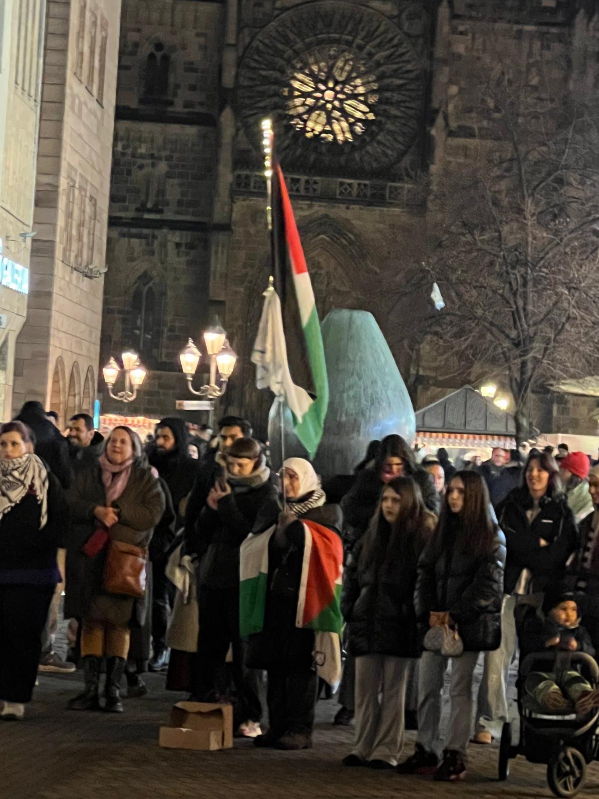 المظاهرة التي دعت إليها الجالية الفلسطينية في نورنبرغ، ومشاركة واسعة من أبناء الجالية الفلسطينية والعربية إلى جانب حشد من المتضامنين الألمان، رفعت شعارات والأعلام الفلسطينية واللبنانية ولافتات تطالب بوقف العدوان فورًا، واحترام القانون الدولي، وحماية المدنيين، ولا سيما الأطفال والنساء.