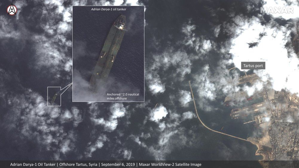 صورة جوية تظهر إفراغ الوقود الإيراني في مرفأ بانياس السوري